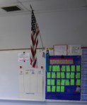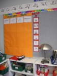 The alphabet chart is above this board. I generally have the students help decide where the wall displays are going, but in the case of the alphabet chart – a royal pain to hang on a good day – the decision is fait accompli. This year I am implementing the Literacy Cafe along with the Daily Five as a management tool. The Cafe strategy board is to the left of the image. I’m still struggling with where to put a Choice chart for students.