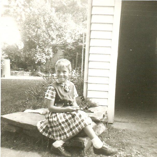 In another photograph, the first day of third grade for me, I am sitting on a rock boarder near our garage. From that image came a flood of memories – the smell of stiff new leather shoes, a new metal lunchbox stylishly tartan plaid, hair pulled back into a tight pony tail, and of course the smell of air on a morning in September when summer fades toward fall.
