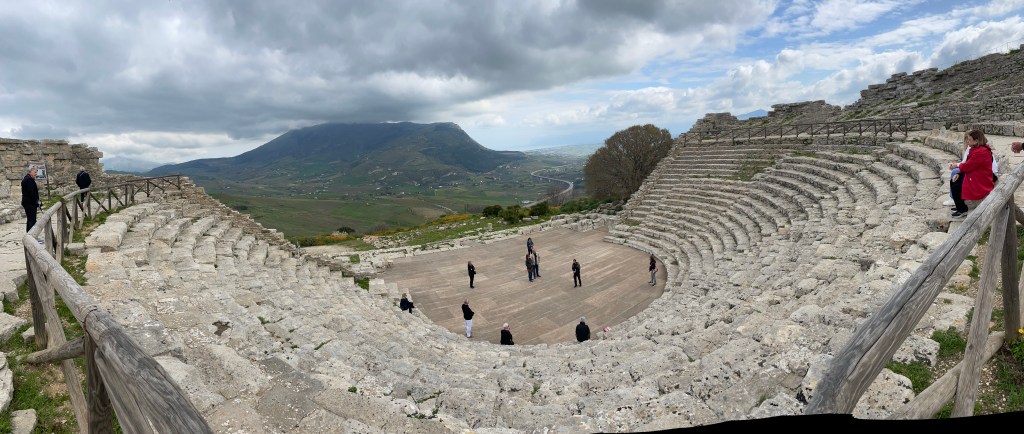 The theater has been part of a restoration and is entered from the top of the concentric semi-circle of stone seating, just as would have happened in ancient times. From the top of the theater, one looks down on the stage area and out across the western Sicilian countryside that surrounds what would be ancient Segesta. Acoustically, this theater is a marvel of human engineering. Even at the top of the seating area, we can hear a tour guide standing at the stage area as clearly as if she were directly in front of us.