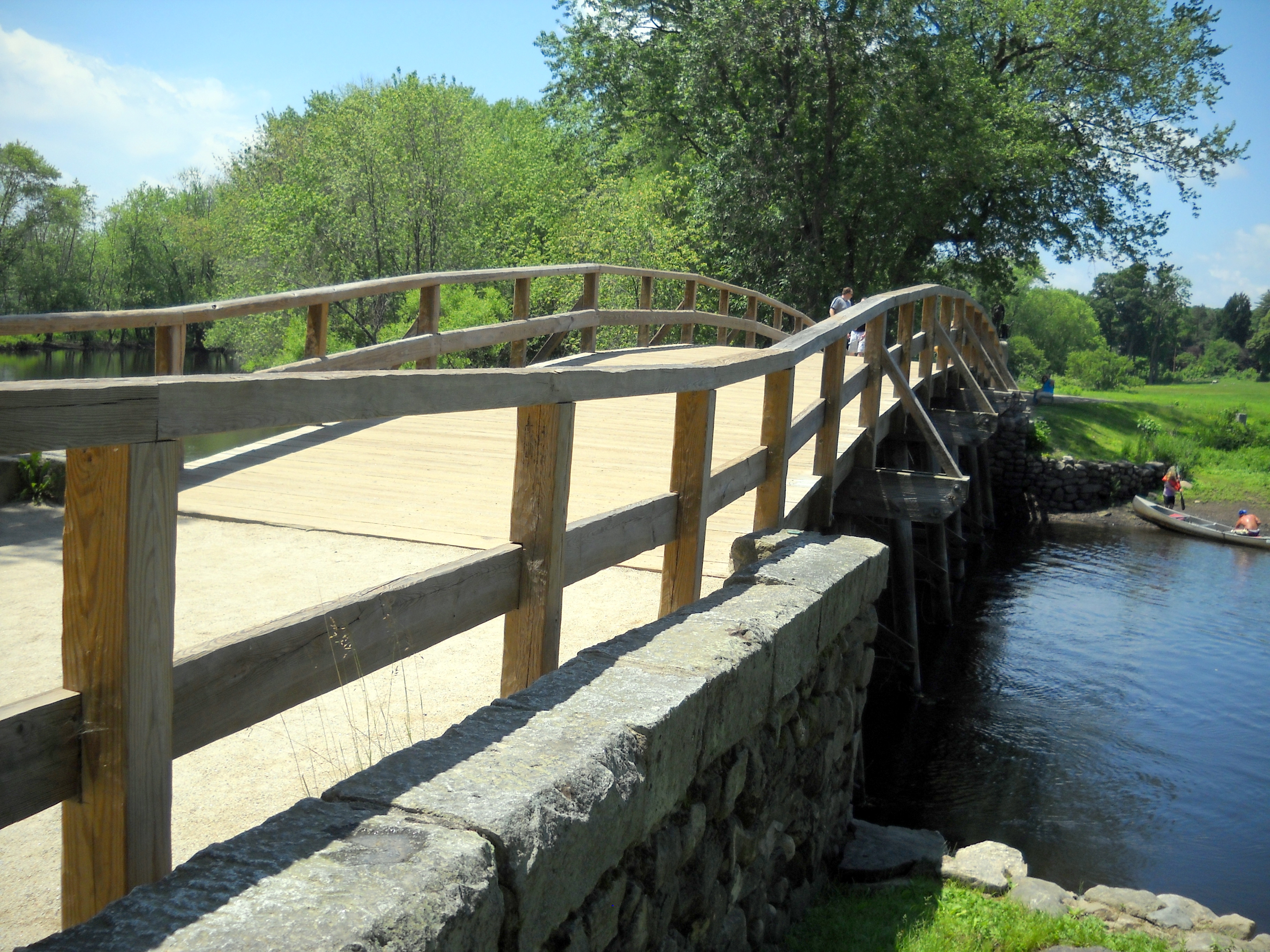 The second house museum on the day’s itinerary was the Old Manse, the home of William Emerson who was a church pastor for Concord during the time of the Revolutionary War and later, a property rented by Nathaniel Hawthorne. Most remarkable was the view of North Bridge from the second floor study of William Emerson. Imagine Emerson’s wife Phoebe looking out this window as the British Regulars lined up to face the colonial militia stationed across the river on the opposite side of the bridge. I would have been frightened beyond imagination at the sight of the British military in all its glory ready to mow down the colonial militia. And then, as the militia proceeded to cross the bridge, the unimaginable — the British Regulars actually trying to retreat from the militia.
