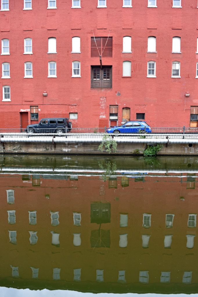The backside of Prescott Street is reflected in the Eastern Canal near the Lower Pawtucket. Along the walkway, the city dwellers on this side of the canal keep small gardens and set plants out near their entryways. With walkways on both sides of the canal and a pedestrian bridge connecting the two sides, this is a pleasant place for not only walking, but for sitting and people-watching.