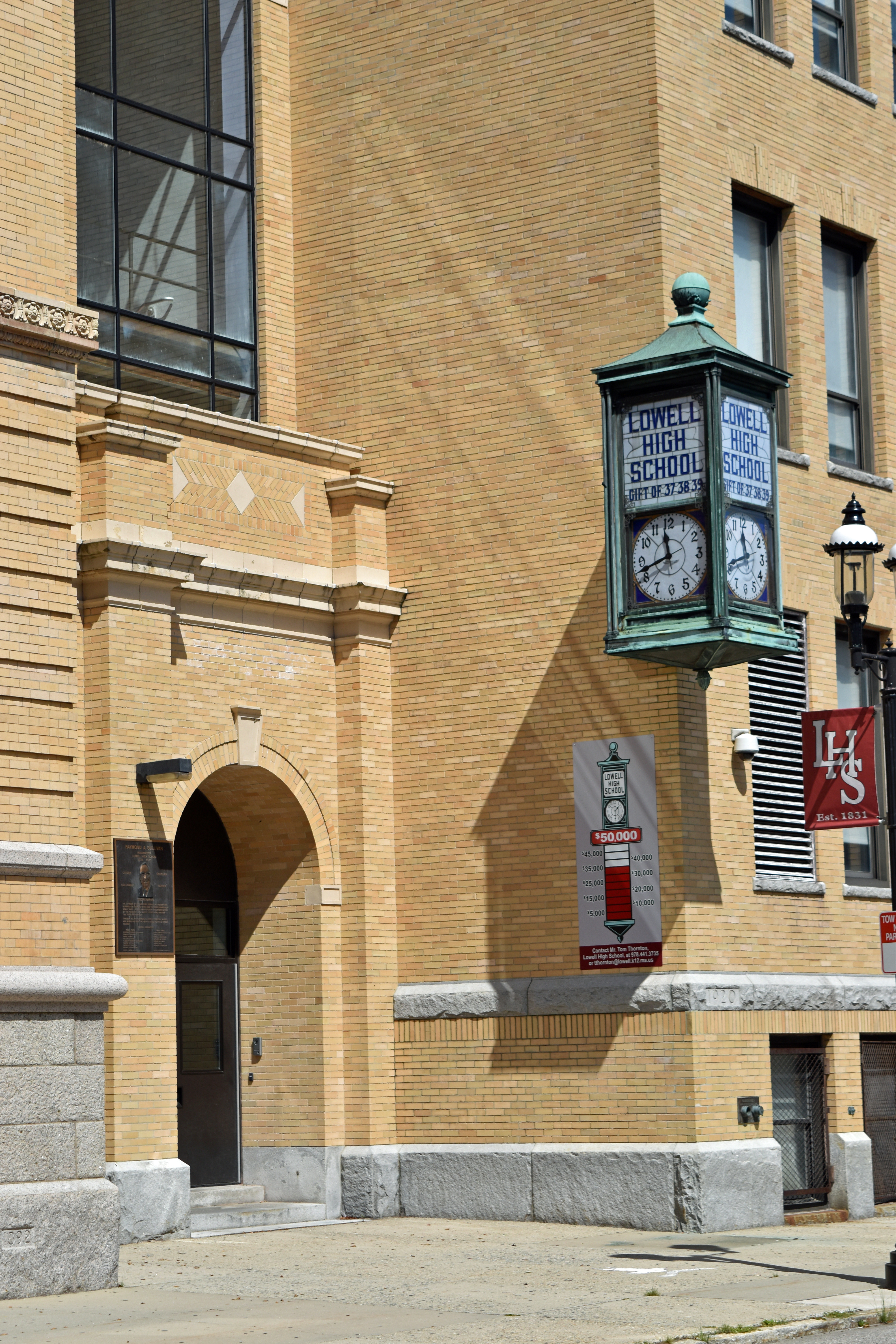 There is almost no need to wear a watch when walking in Downtown Lowell. The Downtown neighborhood sports several beautiful clocks, and the beautifully clock at Lowell High’s Kirk Street entrance has recently been restored. And while the sign tracking the progress of fundraising for this restoration indicates a few more dollars could be put to use, the clock seems to be ready for beckoning students to class, and to be on time.