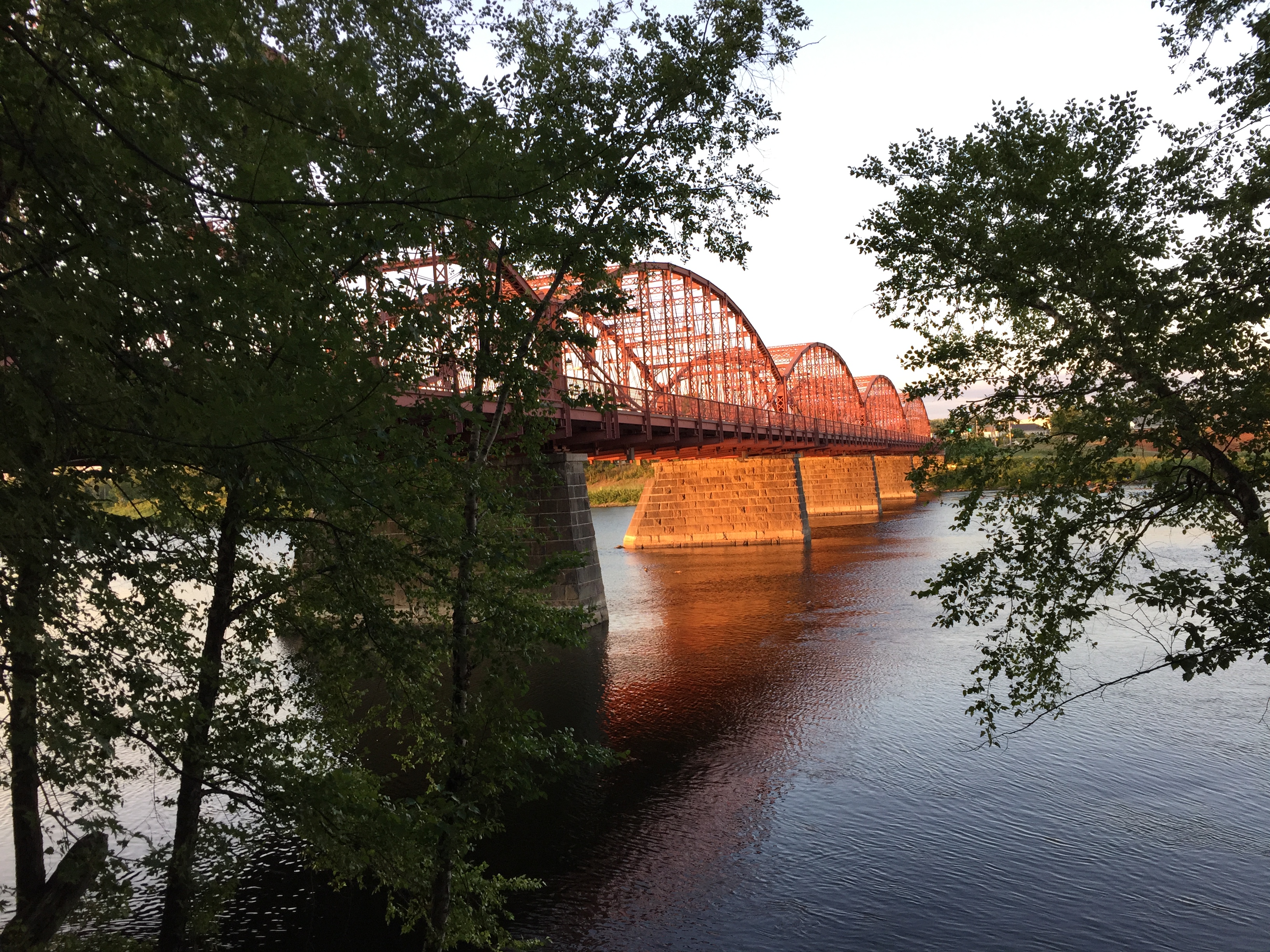 Nearing the Renaissance on the River Condos I noticed a stunning reflection of the red-orange Ouellette Bridge in the Merrimack. And then, I noticed the glow of the bridge. Right place. Right time. And a special shout-out to the bridge painter.